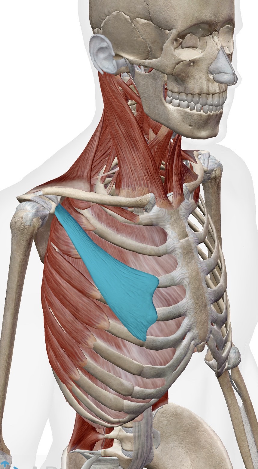 肩甲骨の烏口突起と肋骨つなぐ筋肉で、現代人の生活でわりと疲れやすい場所です。